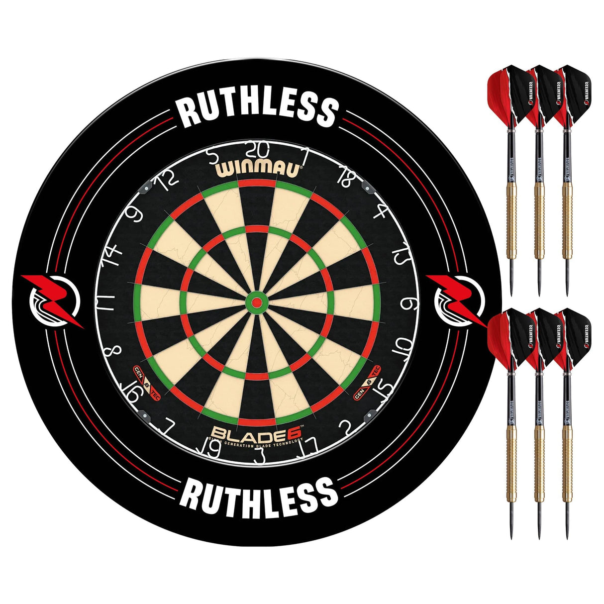 Winmau Blade 6 Dart Board with Surround & 2 Darts Sets - Professional - with Rota Lock System The latest in the Blade Series of dartboards offers stunning design, innovation and craftsmanship, featuring Winmau’s latest, Sixth Generation, dartboard technology. The Blade 6 dartboard delivers outstanding playability, durability and performance. Blade’s pioneering web design features the latest ‘Density Control™’ wire for optimum fibre density and improved dart retention in the double, treble and bullseye zones, for maximum scoring power. Mission Heavy Duty Dartboard Surround with Logo. Ruthless Dartboard Surround - Professional - Printed Design - Black. This surround is constructed from a high quality flexible polymer and is engineered to be extremely durable and specifically designed to conceal penetration marks from stray darts. The surround fits tightly around the dartboard, removing any need for any additional fixings. Ruthless Eagles Darts - Steel Tip Brass - M2 - Ringed - 16g. These quality brass darts are manufactured to the highest specification, with a modern design to complement its setup. Each set comes complete with a set of Ruthless Shafts and a set of Ruthless Flights.